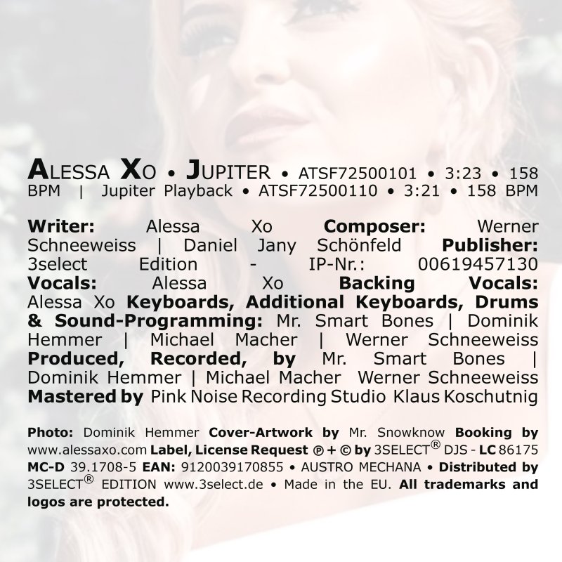 Alessa XO • Jupiter • ATSF72500101 • 3:21 • 158 BPM | Jupiter Playback • ATSF72500110 • 3:23 • 158 BPM | Writer: Alessa Aichinger| Composer: Werner Schneeweiss | Daniel Jany Schönfeld | Publisher: 3select Edition - IP-Nr.: 00619457130 | Vocals: Alessa Xo | Keyboards, Additional Keyboards, Drums & Sound-Programming: Mr. Smart Bones | Dominik Hemmer | Michael Macher | Werner Schneeweiss | Produced, Recorded, Remixed by Mr. Smart Bones | Dominik Hemmer | Michael Macher | Werner Schneeweiss | Mastered by Pink Noise Recording Studio Klaus Koschutnig | Jupiter-Video Produced by Michael Macher & Dominik Hemmer (uspmedia.at) | Booking & Management by www.alessaxo.com | Label, License Request (P) + © by 3SELECT® DJS - LC 86175 • MC-D 39.1708-5 • EAN: 9120039170855 • AUSTRO MECHANA • Distributed by 3SELECT® EDITION - www.3select.de | Made in the EU. All trademarks and logos are protected.